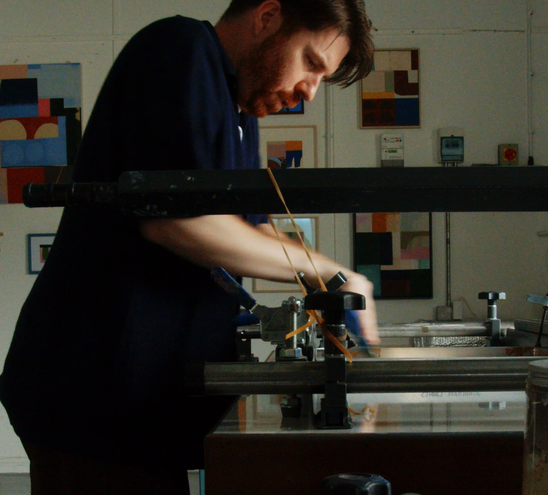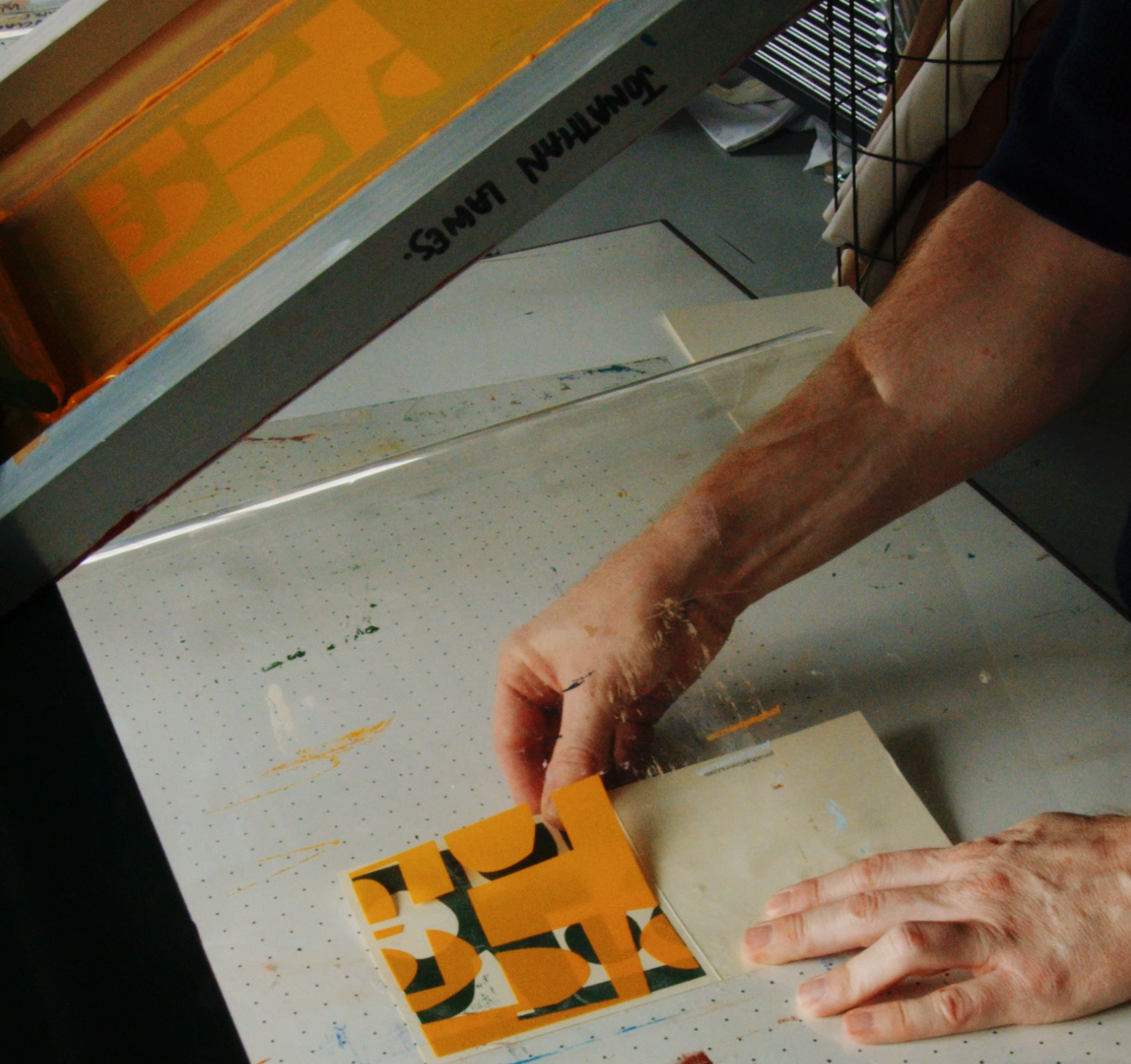 "Welcome to my studio!" Jonathan Lawes beams, guiding us around the white-walled, welcoming expanse of his South London studio. Light pours through two enormous windows, throwing light on a large drying rack bursting with Jonathan's signature abstract works and his workbench, stacked with brightly coloured paint pots. "The windows are lovely" he enthuses, gesturing out at the Thames, "but when it's pitch black at four pm…" Luckily, today it is sunny, and, as in Jonathan's vibrant, geometric prints, there's not a drop of darkness in sight.