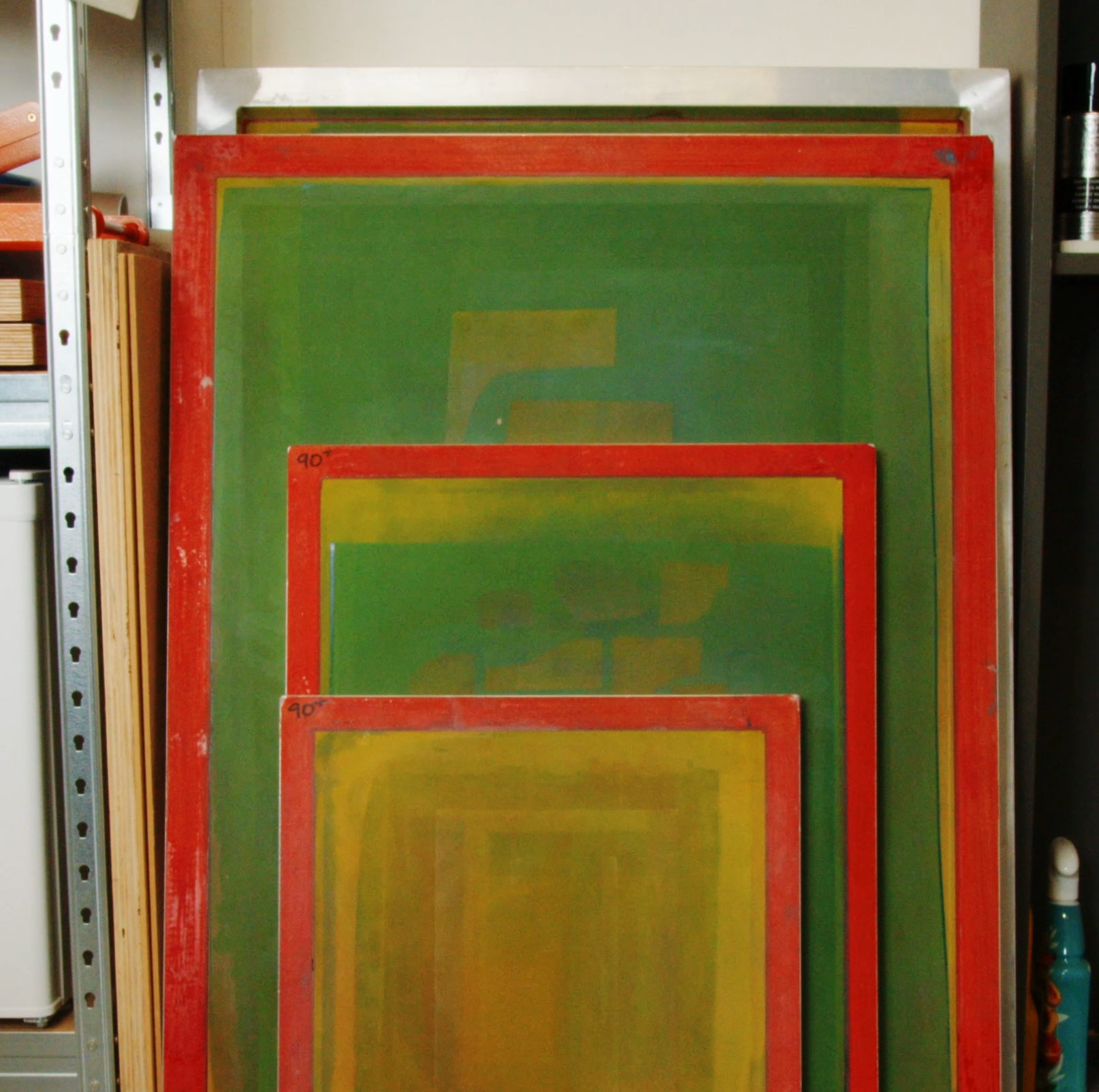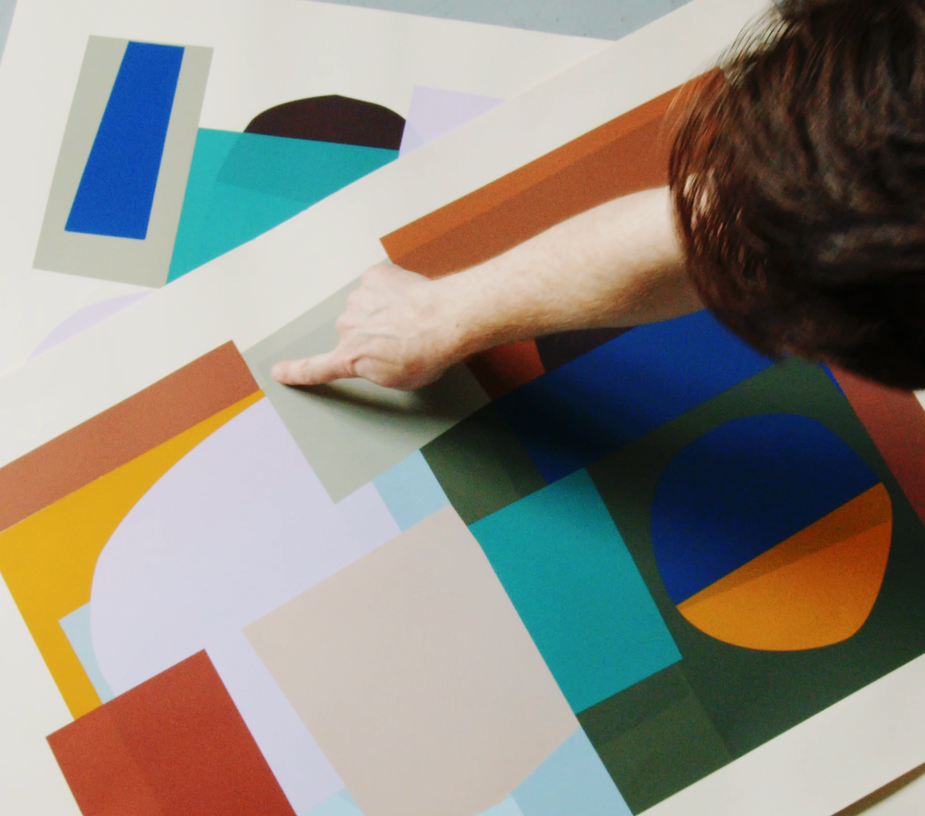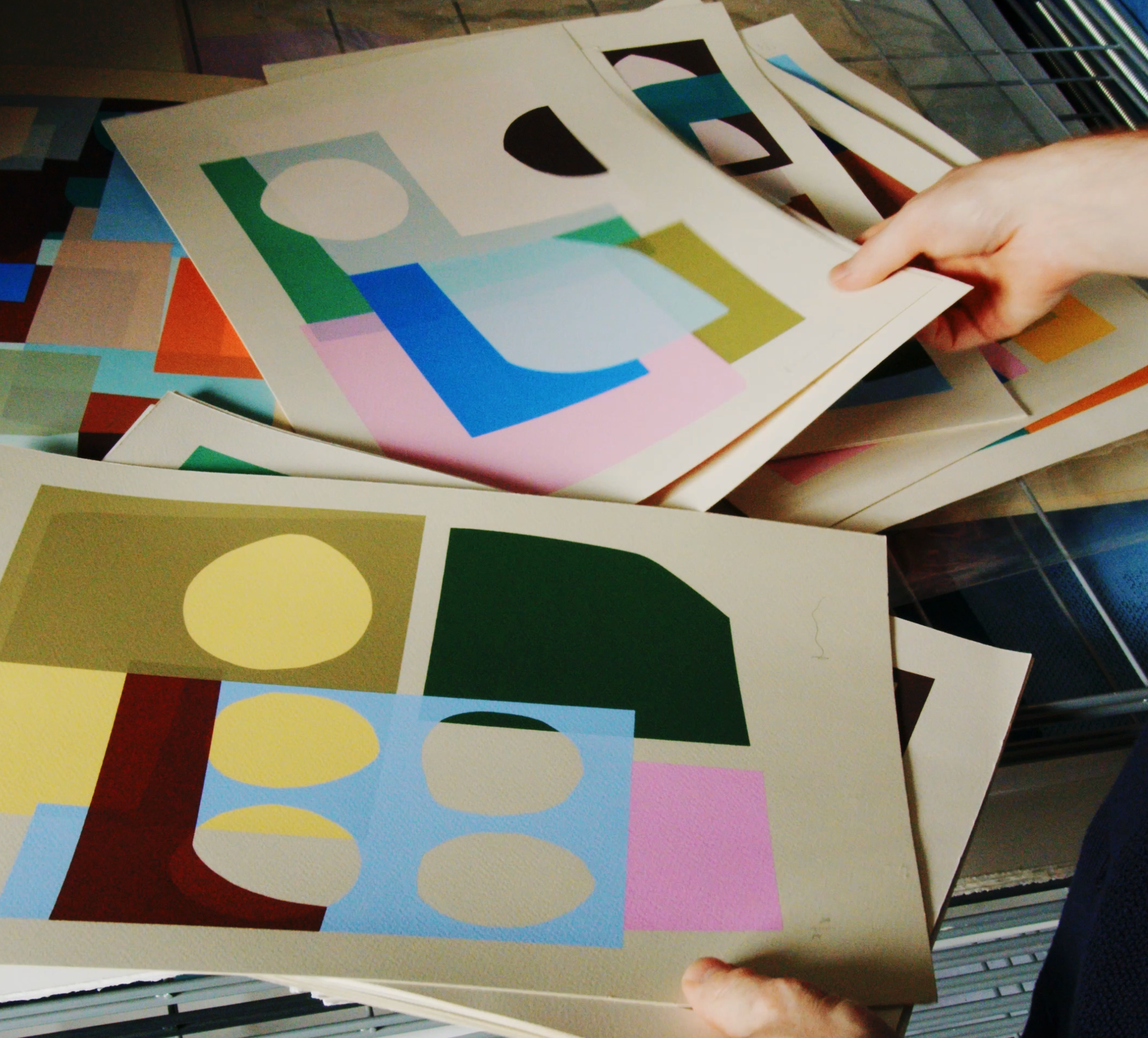 The work — screen printed shapes, delicately overlayed in a rhythmic interplay of colour and form — does indeed speak for itself, although it’s the vibrant colours, not words, that do the talking. "I'm not a poet, I just love colour!" Jonathan smiles. From Klein blues to mustard yellows, from the muted minimalism of Berlin accented with flashes of neon, shifting into a punchy pastel when a dash of white is added, to the volcanic grey and cacti green found in Lanzarote, Jonathan works intuitively, finding joy in discovering new colours and forms. "I'm like a kid having fun with my paints" he explains, while touring us around his print table. A childlike enthusiasm, he impresses, "is not a negative thing… it's like when you're a child and you embrace stuff because you don't know anything." Becoming older, he suggests, can make us more judgemental — "I like this or I don't like that" — a discernment Jonathan resists through an openminded curiosity: "who knows if red goes with green?! I'm not going to stare at a colour wheel, I'll just go and try it." Sometimes, he explains, not following the rules can get a really nice outcome. "Why not play a bit?" he asks us, "there's so many formalities in life already!"